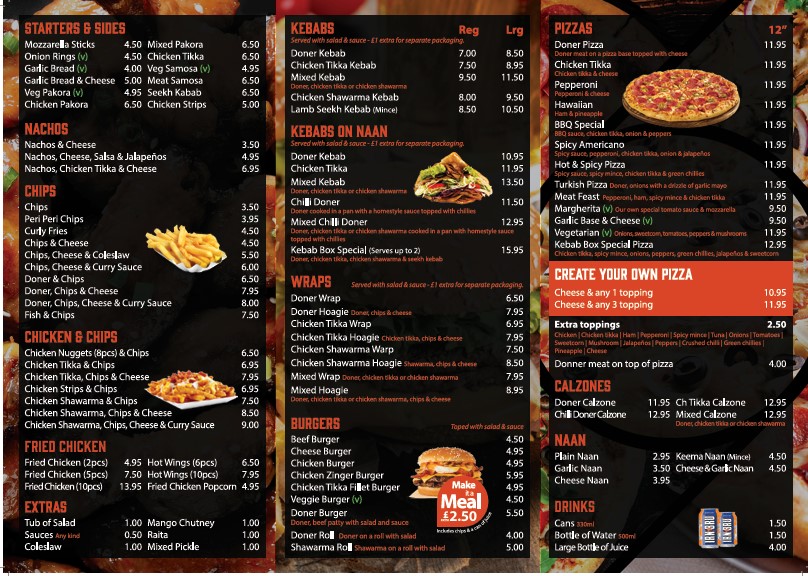 Large Doner, chicken tikka kebabs or chicken shawarma (choose any two), chips 2 cans of juice